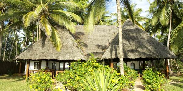 Le Pongwe Beach Hotel est une petite structure entourée de palmiers qui ne compte que 6 bâtiments aux murs blancs et aux toits de makuti, situés aux abords de la plage. Chaque batiment abrite 2 à 3 chambres. Seul un bâtiment de 3 chambres est en retrait de la plage.