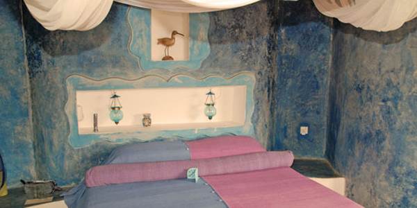 Composé de plusieurs petites maisons de campagne, l'établissement offre un logement et des parties communes agréables, décorées de nombreux coussins et tissus dans les tons de bleus.